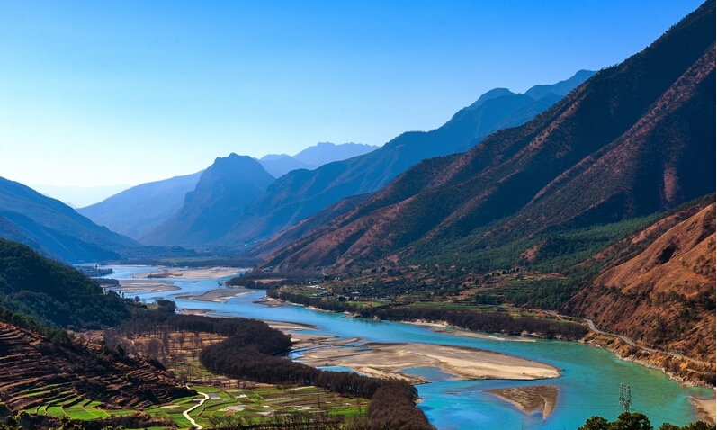 三江指金沙江、瀾滄江和怒江。她們均起源于青藏高原的唐古拉山,流入云南境內(nèi)后像“川”字一樣向南并流400公里而不交匯,最近處三江直線距離僅66 公里。各江從高原強(qiáng)烈下切,水流湍急。兩岸雪峰層出,瀑布眾多。山頂又鑲嵌著許多秀麗的高原湖泊。懸河飛瀑注入大江,十分短直,呈非字形。搭乘昆明、成都、拉薩至中甸的航班,可從空中一覽三江并流全景奇觀,景象世所罕見。